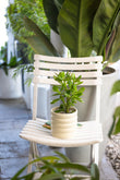 La Crassula ovata, conocida comúnmente como Jade, es una suculenta originaria de Sudáfrica. Esta planta destaca por sus hojas carnosas y brillantes que almacenan agua, lo que la hace ideal para ambientes secos.
