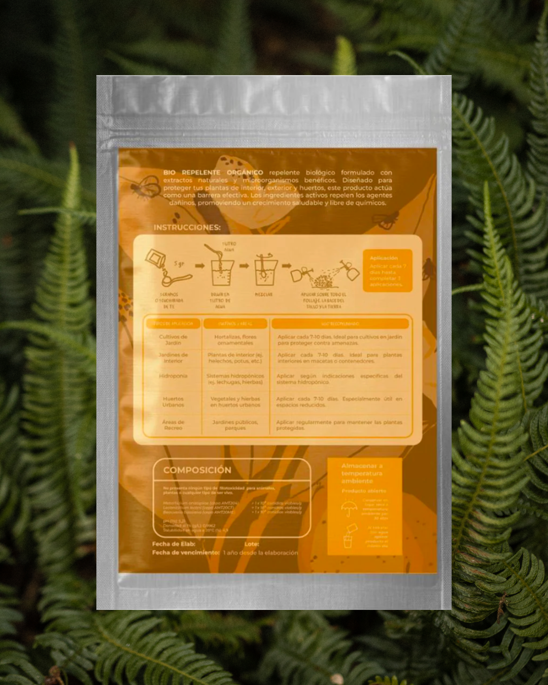 Además de repeler plagas, este bio repelente actúa como un efectivo agente de control biológico. Es seguro para hogares con niños y mascotas, así como para huertas comestibles, eliminando la necesidad de productos químicos. Con un solo sobre, rinde hasta 20 litros de solución, cubriendo 1000 m² y garantizando un control prolongado y económico.