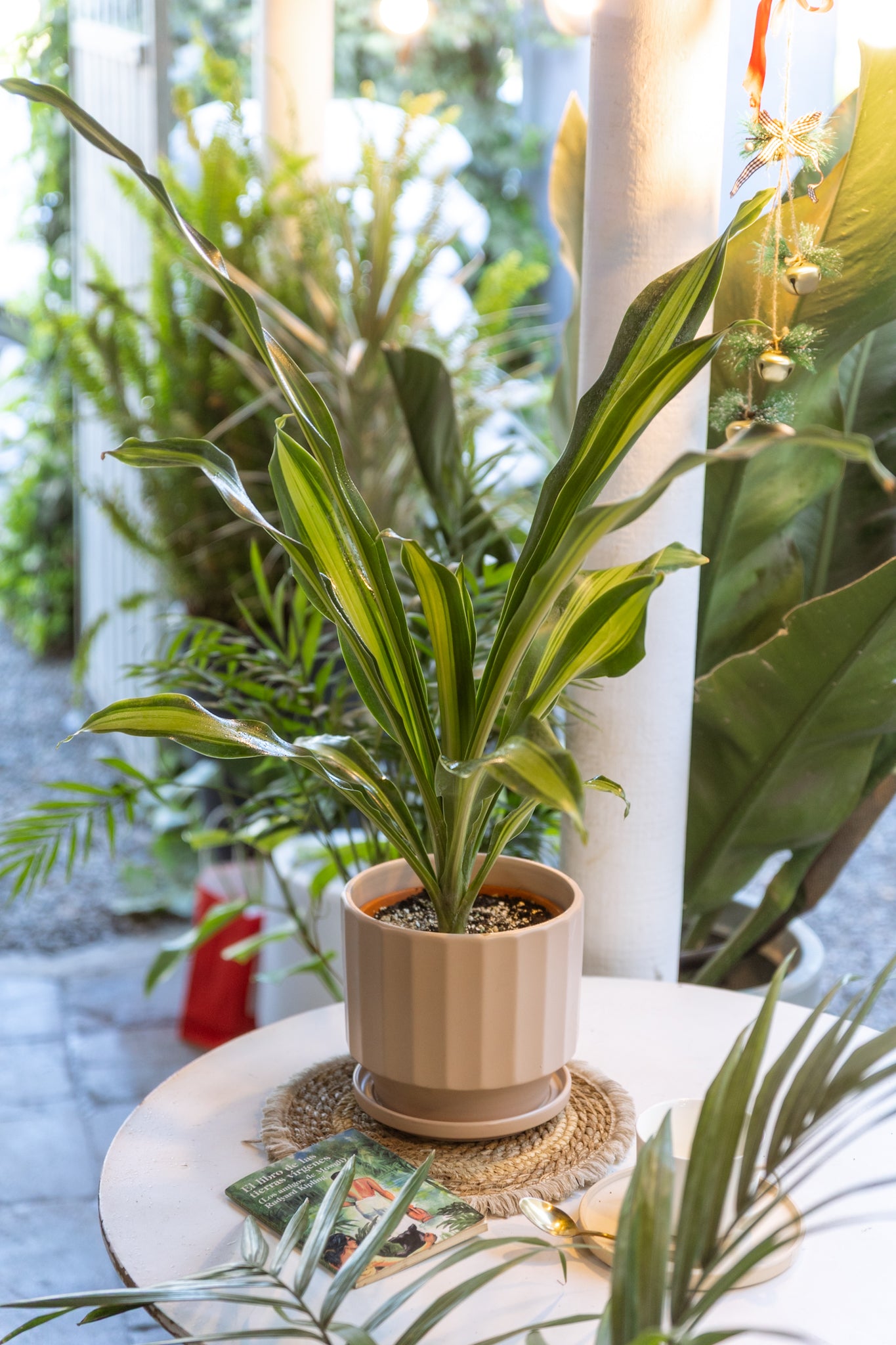 La Dracaena Fragrans 'Gold' se caracteriza por sus hojas largas y delgadas que presentan un tono verde intenso en el centro y un degradado dorado en los bordes. Su apariencia elegante y su crecimiento vertical hacen que sea una elección llamativa para espacios interiores.
