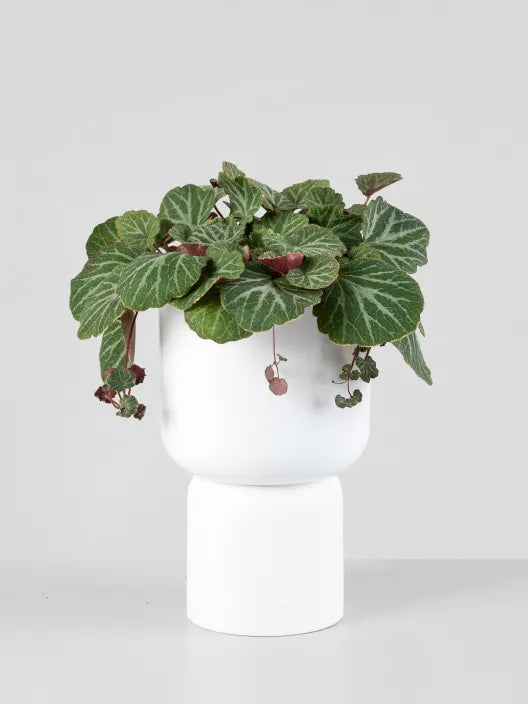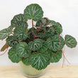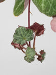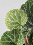 Las hojas son redondeadas, verde oscuro, ligeramente peludas, con venas plateadas y envés rosado.